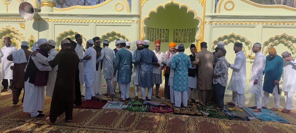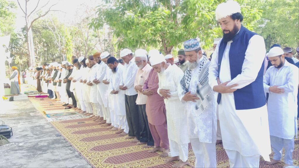 тАЛрдИрджрдЧрд╛рд╣ рдореИрджрд╛рди рдкрд░ рдЬрд╛рдорд╛ рдорд╕реНрдЬрд┐рдж рдХреЗ рдкреЗрд╢ рдИрдорд╛рдо рдореМрд▓рд╛рдирд╛ рдиреМрд╢рд╛рдж рдЖрд▓рдо рд╕рд╛рд╣рдм рдиреЗ рдИрдж рдХреА рд╡рд┐рд╢реЗрд╖ рдирдорд╛рдЬрд╝ рдЕрджрд╛ рдХрд░рд╛рдИред рдирдорд╛рдЬрд╝ рдХреЗ рдмрд╛рдж рдкрдврд╝реЗ рдЧрдП рдЦреБрддрдмреЗ рдореЗрдВ рдЗрдВрд╕рд╛рдирд┐рдпрдд рдФрд░ рдореЛрд╣рдмреНрдмрдд рдХрд╛ рдкреИрдЧрд╛рдо рджрд┐рдпрд╛ рдЧрдпрд╛ред рдЗрд╕ рджреМрд░рд╛рди рд╣рдЬрд╛рд░реЛрдВ рд╣рд╛рде рдПрдХ рд╕рд╛рде рдЖрд╕рдорд╛рди рдХреА рдУрд░ рдЙрдареЗ рдФрд░ рджреЗрд╢-рдкреНрд░рджреЗрд╢ рдореЗрдВ рддрд░рдХреНрдХреА, рдЦреБрд╢рд╣рд╛рд▓реА рдФрд░ рдЕрдорди-рдЪреИрди рдХреЗ рд▓рд┐рдП рд╡рд┐рд╢реЗрд╖ рджреБрдЖрдПрдВ рдорд╛рдВрдЧреА рдЧрдИрдВред рдирдорд╛рдЬ рдХреЛ рд▓реЗрдХрд░ рдХрдмреНрд░рд┐рд╕реНрддрд╛рди рдХрдореЗрдЯреА рджреНрд╡рд╛рд░рд╛ рдХреА рдЧрдИ рдорд╛рдХреВрд▓ рд╡реНрдпрд╡рд╕реНрдерд╛рдУрдВ рдХреА рд╕рдорд╛рдЬрдЬрдиреЛрдВ рдиреЗ рдореБрдХреНрдд рдХрдВрда рд╕реЗ рдкреНрд░рд╢рдВрд╕рд╛ рдХреАред