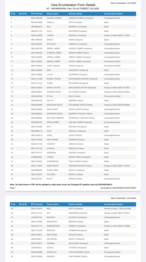 हैरान कर देने वाला मामला तब सामने आया जब भाकीराम सोलंकी नामक युवक का नाम सूची से यह कहकर हटा दिया गया कि उसकी मृत्यु हो चुकी है, जबकि वह पूरी तरह स्वस्थ और जीवित है। इसी तरह जाई गाँव के गुलसिंग भुरला, भिलीबाई, बाली और सुभद्रा जैसे कई ग्रामीणों के नाम भी सूची से नदारद हैं। पीपरकुंड के प्रताप मेहता और रेखा को “अनुपस्थित” बताकर बाहर कर दिया गया, जबकि ग्रामीणों का कहना है कि वे सर्वे के समय गाँव में ही मौजूद थे।