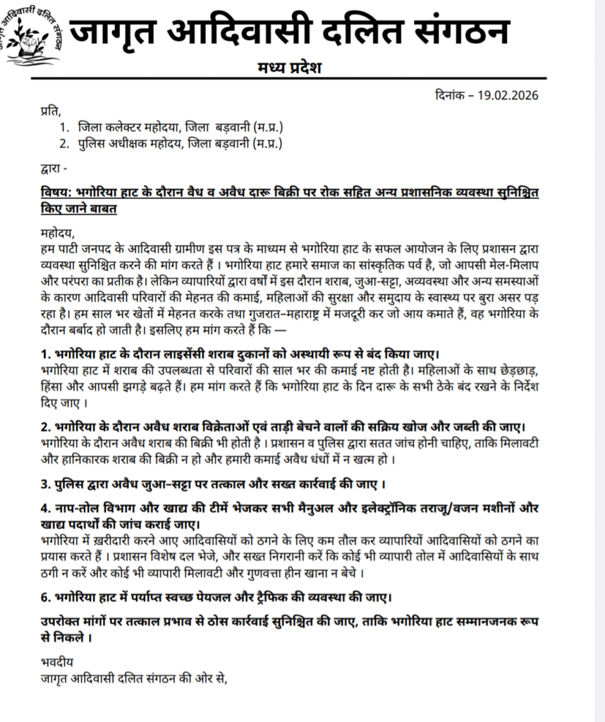 ज्ञापन के माध्यम से आदिवासियों ने प्रशासन से मांग की है कि आगामी भगोरिया हाट के दौरान वैध और अवैध शराब की बिक्री पर पूर्ण प्रतिबंध लगाया जाए। साथ ही हाट में होने वाले जुआ-सट्टा, कम नाप-तौल और मिलावटी खाद्य पदार्थों की जांच के लिए ठोस कार्रवाई की जाए। संगठन का कहना है कि साल भर की मेहनत की कमाई हाट में शराब और अव्यवस्था के कारण बर्बाद हो जाती है।