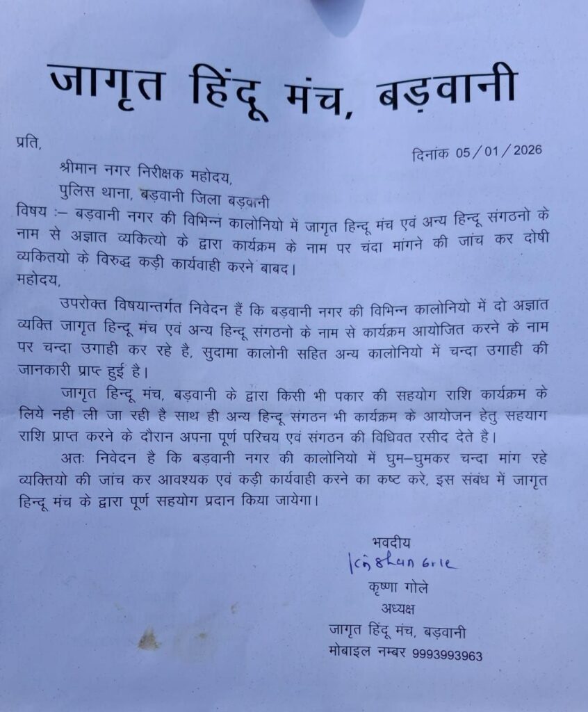 ​बड़वानी में जागृत हिंदू मंच एवं अन्य हिंदू संगठनों के नाम पर अवैध रूप से चंदा वसूलने का मामला सामने आया है। इस संबंध में हिंदू संगठनों के पदाधिकारियों ने सोमवार को बड़वानी नगर पुलिस थाना पहुंचकर नगर निरीक्षक श्री दिनेश कुशवाह को एक शिकायत सौंपी और फर्जीवाड़ा करने वाले अज्ञात व्यक्तियों के खिलाफ सख्त कार्यवाही की मांग की।