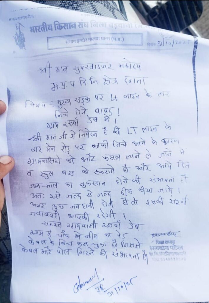 भारतीय किसान संघ (बीकेएस) की ग्राम इकाई रसवा डेब ने गाँव में कृषि पंपों की बिजली के ढीले पड़े LT (लो टेंशन) तारों की गंभीर समस्या को लेकर विद्युत वितरण केंद्र दवाना के जूनियर इंजीनियर (जे.ई.) कन्हैया जी बर्मन को ज्ञापन सौंपा है।