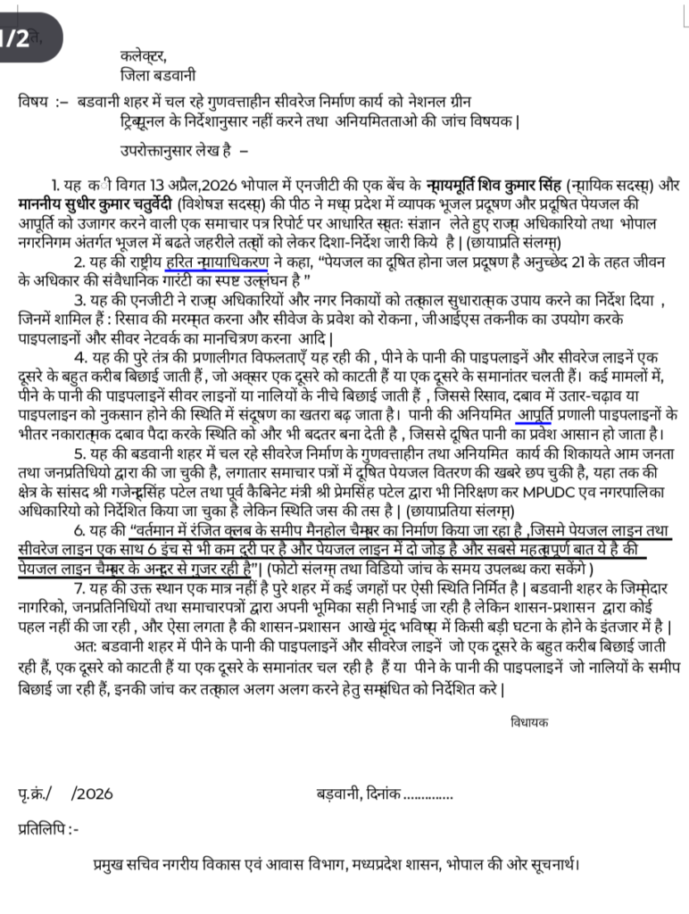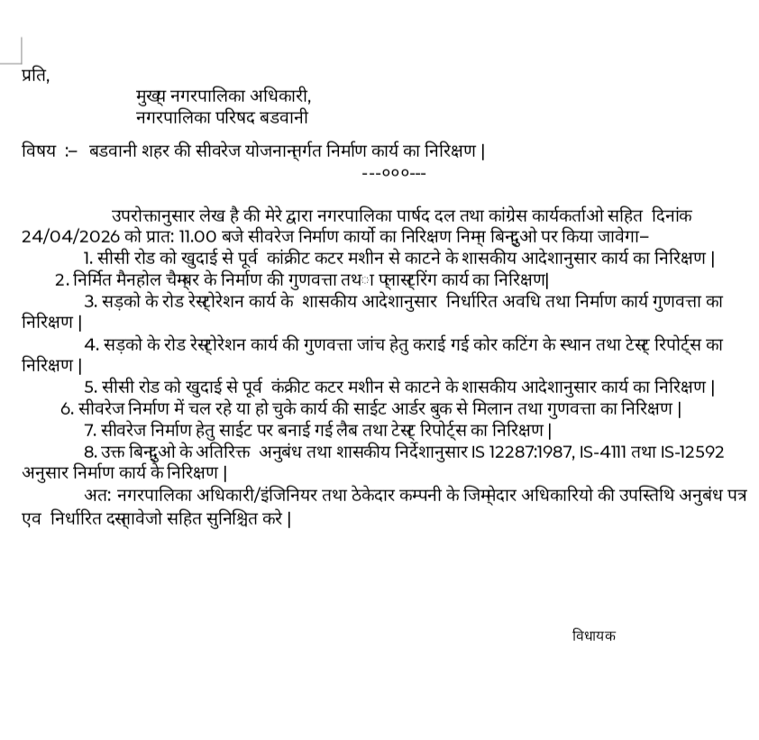 कल सुबह 11 बजे होगा बड़ा निरीक्षण: विधायक ने नगर पालिका परिषद बड़वानी को भी पत्र लिखकर निर्देश दिए हैं कि दिनांक 24 अप्रैल 2026 को प्रातः 11:00 बजे सिवरेज निर्माण कार्यों का संयुक्त निरीक्षण किया जाएगा।